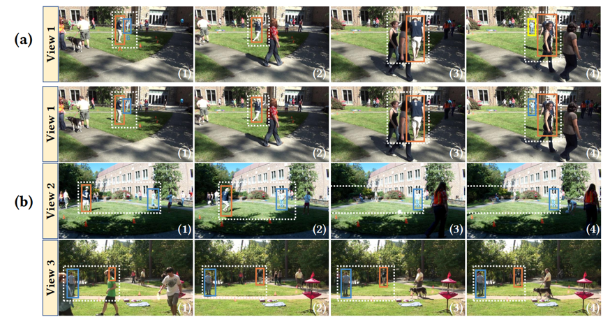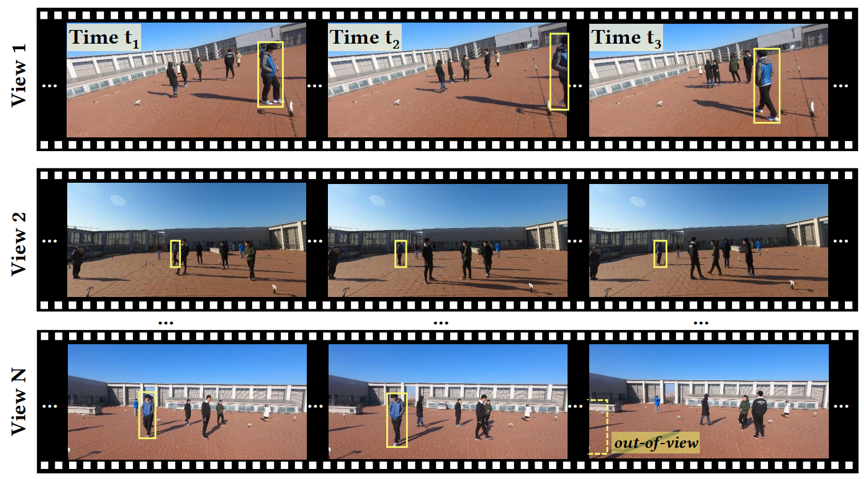近年来,随着监控安防需求的提升,多目标跟踪(MOT),尤其是多行人跟踪,已经成为了多媒体分析的一个重要的研究领域。现有的多行人跟踪算法存在两个重要的局限:首先,现有方法往往利用单一视角,在行人互相遮挡的情形下容易造成目标丢失,其次,现有的基于深度学习的算法需要大量的人工标注数据进行模型训练。针对上述问题,本文提出了自监督的多视角多行人关联跟踪(MvMHAT)方法。其中,多视角可以缓解行人遮挡问题,而自监督可以避免大量的数据标注。不同于现有的多目标跟踪任务和多目标跨相机跟踪任务只考虑行人跨时间帧的关联,如图1所示,多视角多行人关联跟踪任务可以同时跨视角和跨时间地将行人关联起来,在多人场景下的视频监控具有重大的意义。