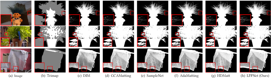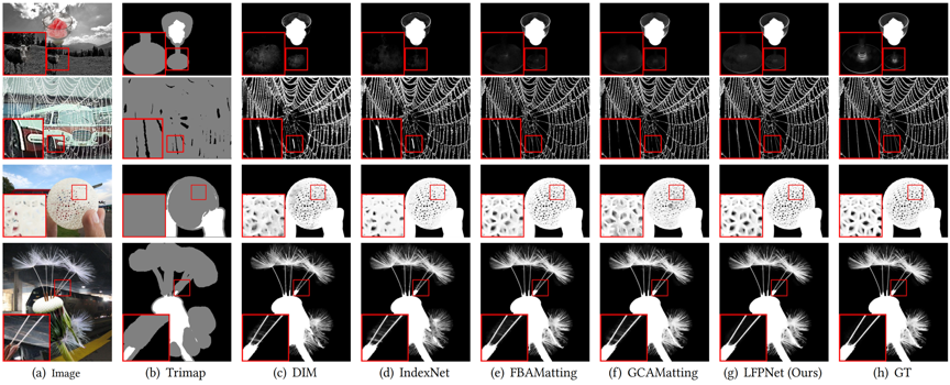 论文在多组数据上进行了评估,如图4,5,6为提出的方法在AlphaMatting,Adobe Composite-1K和真实世界高分辨率图像上测试的定性结果。提出的方法有更好的视觉观感,在网状区域可以利用长距离特征将背景分出来,在大块未知区域的情况下能够更加稳定的预测出前景目标的透明度遮罩。如表1为提出的方法在AlphaMatting,Adobe Composite-1K图像上的定量结果,提出的方法取得了较好的指标。定性与定量实验证明了本文提出的方法在抠图任务上的有效性。