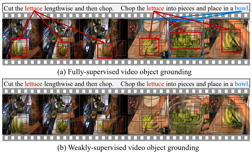根据自然语言描述在视频中对目标物体区域进行定位是一项在诸多下游任务中都需要的能力。如图1所示,由于在视频中进行细粒度的物体标注十分昂贵,因此目前大多数方法都聚焦于弱监督的训练设定,即只有视频和对应的自然语言描述语句标注。虽然该任务近期取得了许多进展,但是它们都没有充分挖掘自然语言描述在跨模态匹配中的潜力。一方面,大多数方法仅从自然语言描述中简单的提取物体文本并用固定的词向量对其进行表示,而忽视了该物体文本丰富的上下文句子内容。另一方面,一些方法尝试了利用上下文来丰富物体文本表示,但这导致了不稳定的跨模态对齐训练,从而大幅降低了性能。其原因在于,在弱监督设定下缺乏对物体区域和对应文本的直接监督信号,多样的物体文本表示会导致跨模态匹配噪声很大,而稳定的物体文本表示则可以在匹配空间中为物体区域提供稳定的聚类中心。