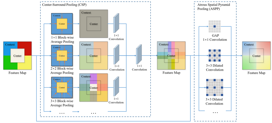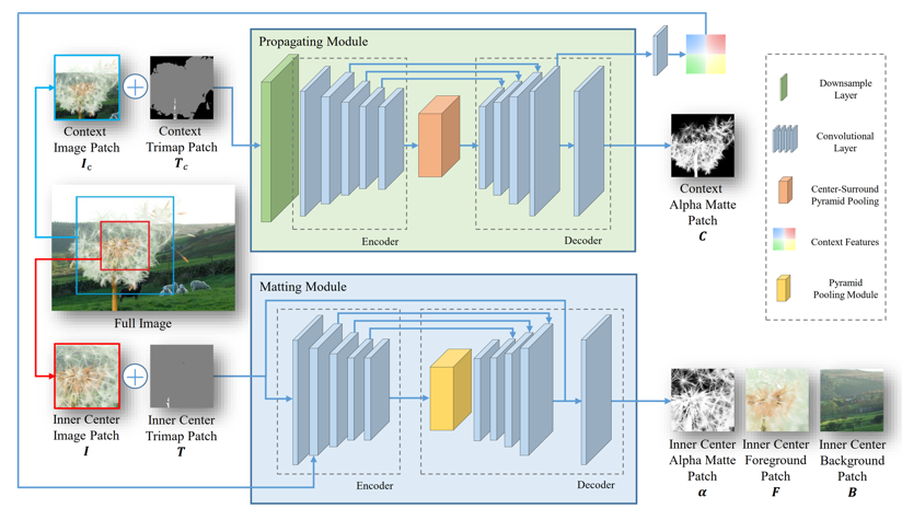 为了解决以上问题,我们提出了进行长距离特征传播的抠图网络LFPNet。LFPNet架构如图2所示,网络采取了一个基于块的推断方式,在图像上依滑窗的方式提取中心图块和环绕着中心图块的上下文图块,然后输入网络抠图模块和传播模块处理。上下文图块在降采样后使用传播模块进行长距离特征传播,为了将上下文图块的信息传播到中心区域,我们设计了一个中心周围金字塔池化模块,如图3所示,通过在更大范围内进行多尺度块级池化和孔洞卷积平滑显式地完成了长距离特征传播。传播模块提取的特征与抠图模块的局部特征结合后直接可以预测高精度的透明度遮罩。