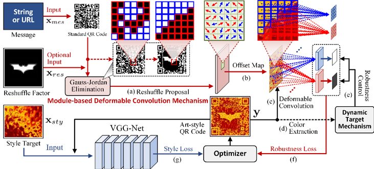 图2 整体流程图。(a)-(c) 基于模块的可变形卷积机制。(d)(e) 动态目标机制。(f)(g) 优化器采用样式损失和鲁棒性损失来约束输出QR码的艺术风格和扫描鲁棒性。