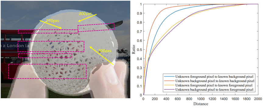 图1 Adobe Composite-1K抠图数据集展示与数据统计。左图:抠图图像展示,分辨未知区域内的前景与背景需要长距离外的已知区域信息;右图:抠图数据统计,在Adobe抠图数据集中与位置区域关联的最邻近已知区域超越了传统CNN网络感受野。