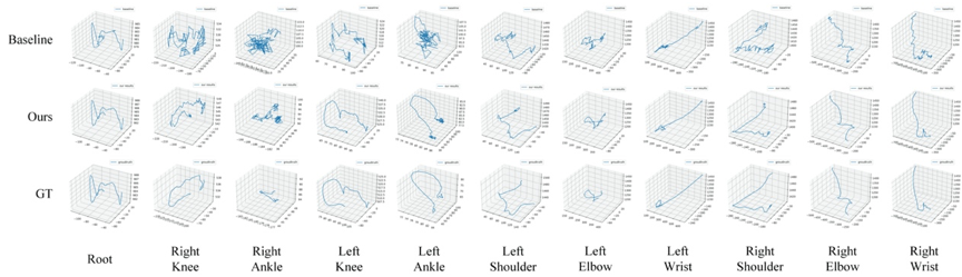 图2 Human3.6M S11序列中容易被遮挡的关节轨迹流畅性可视化比较