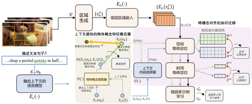 基于上述观察,我们提出了一个稳定上下文学习的框架(如图2所示),其同时具备稳定训练和丰富上下文信息的优势。我们旨在学习一个稳定的物体概念表示,其对于在不同上下文句子中的同一物体文本而言,具有特征不变性和上下文泛化性。为此,我们设计了上下文感知的物体稳定器模块和跨模态对齐知识迁移模块。这两个模块可以相互配合,在文本模态中将丰富的上下文信息注入到稳定的物体概念中,同时在跨模态对齐中迁移上下文的丰富知识信息。具体地,对于上下文感知的物体稳定器模块,我们利用语言模型(如:BERT)提取同一物体文本在不同句子中的上下文信息,然后利用对比学习的策略将其注入到对应的稳定物体概念表示中。对于跨模态对齐知识迁移模块,我们从物体文本的上下文信息中提取与该物体概念表示相关的部分知识,然后将这一部分知识通过在跨模态对齐的时空相似度分数层面进行迁移,从而帮助学习稳定的物体概念表示。最后,整个模型在一个帧级别的多实例学习框架下进