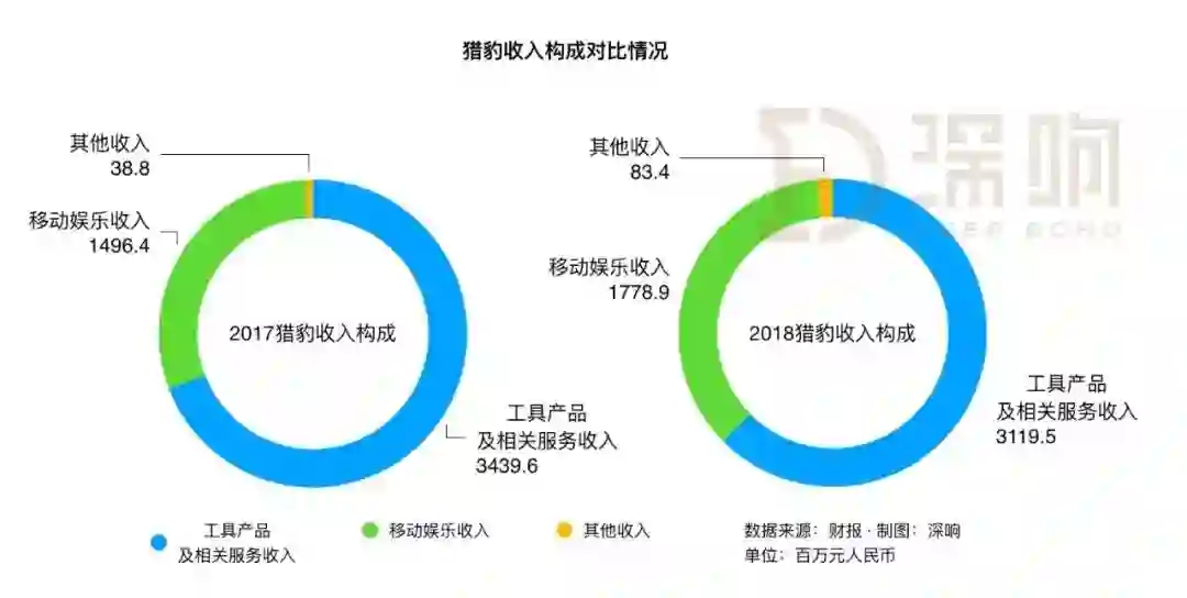 2018年,猎豹的工具业务比较稳定,猎豹清理大师、猎豹安全大师等系统工具仍然保持着盈利能力,另外还推出了可视铃声应用「豹来电」,边打字边赚钱的输入法「趣输入」,这两款产品国内增速都很高。