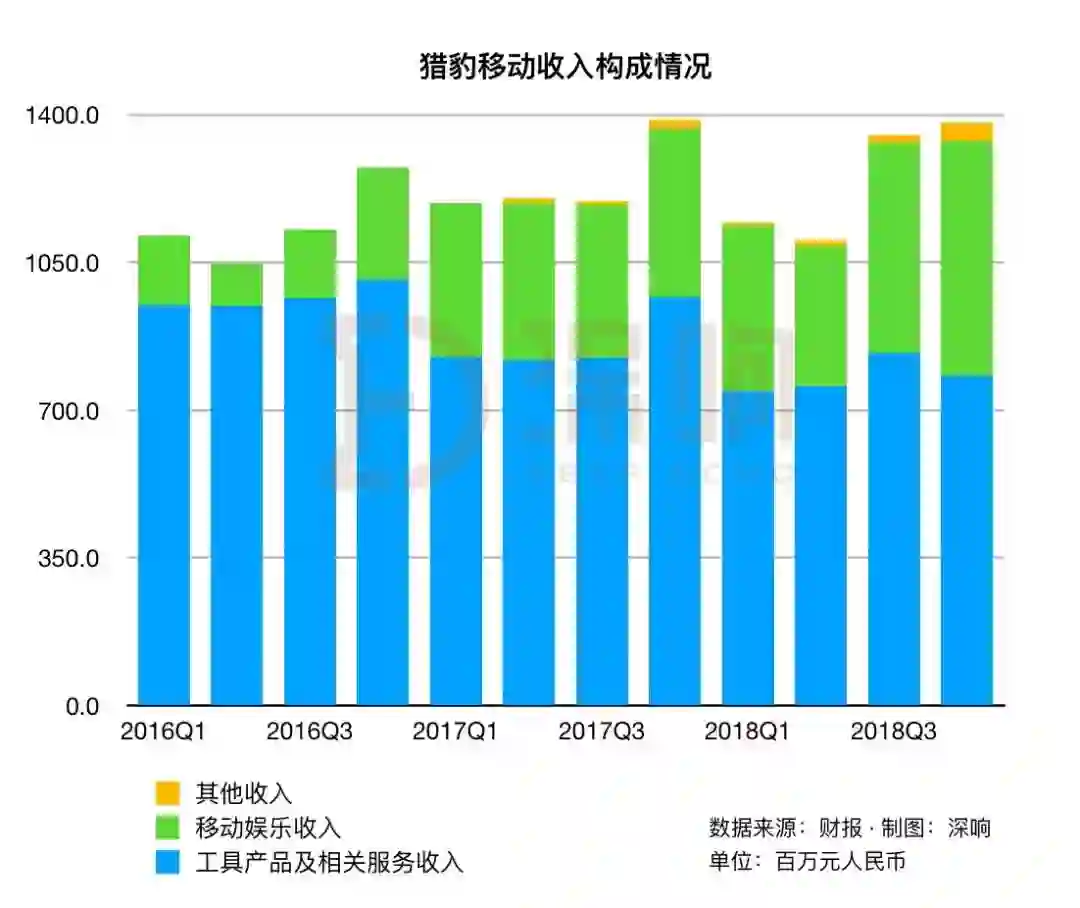 先来看猎豹的各项收入。猎豹把收入分成了三大块——工具应用业务收入、移动娱乐收入、其他收入。