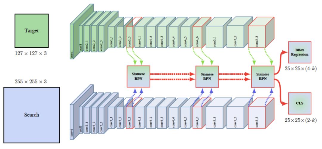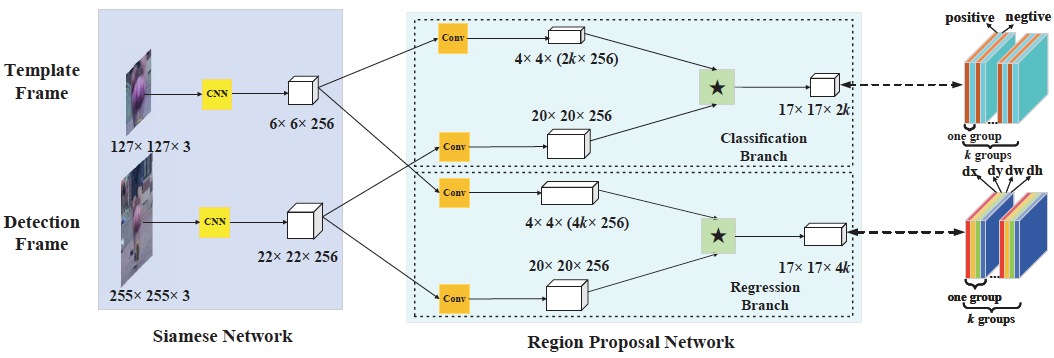 就像DSST之前的众多相关滤波跟踪算法一样,SiamFC难以应对物体尺度的变化。SiamRPN[10](CVPR18, B. Li et al.)则借鉴了目标检测领域常用的RPN(Region Proposal Network,区域生成网络)用于预测新图像中目标的尺度。