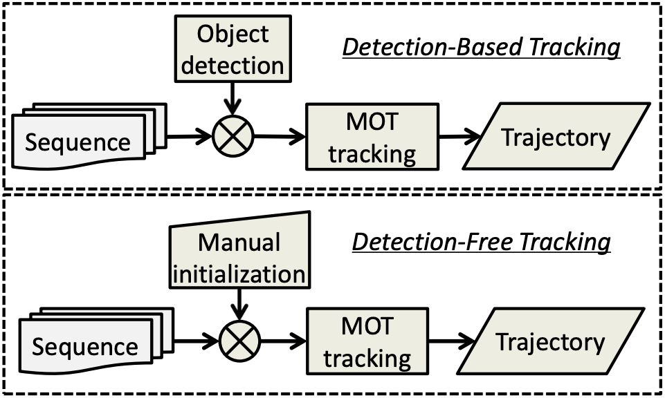 按照初始化方式,常见的多目标跟踪算法一般可分为基于检测的跟踪(Detection-Based Tracking)和无检测的跟踪(Detection-Free Tracking)。DBT要求由一个目标检测器首先将每帧图像中的目标检测出来,而DFT要求已知每个目标首次出现的位置,再对每个目标分别进行跟踪(这一点可以看作是在同一个视频中进行的多个单目标跟踪)。显然,前者的设定更接近实际应用场景,也是学界研究的主流。