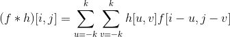 h 和 f 分别为核和图像,代表着我们要搜索的目标模版和存在要搜索的目标的图像。如果这个公式对你来说有点难以理解,那你又能否记起离散图像空间卷积运算的定义: