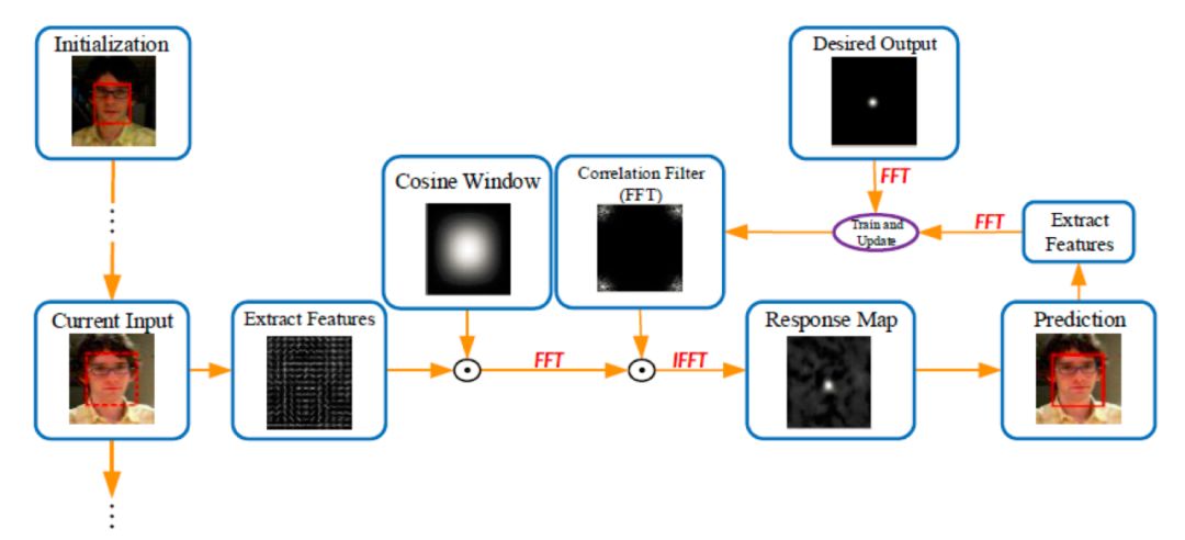 在这个大树中,MOSSE成为了CF(Correlation Filter,即相关滤波)目标追踪算法的鼻祖。在MOSSE之后,各种基于相关滤波思路的目标追踪方法蓬勃发展、日渐繁荣,而它们的目标追踪算法基本框架如下图所示。
