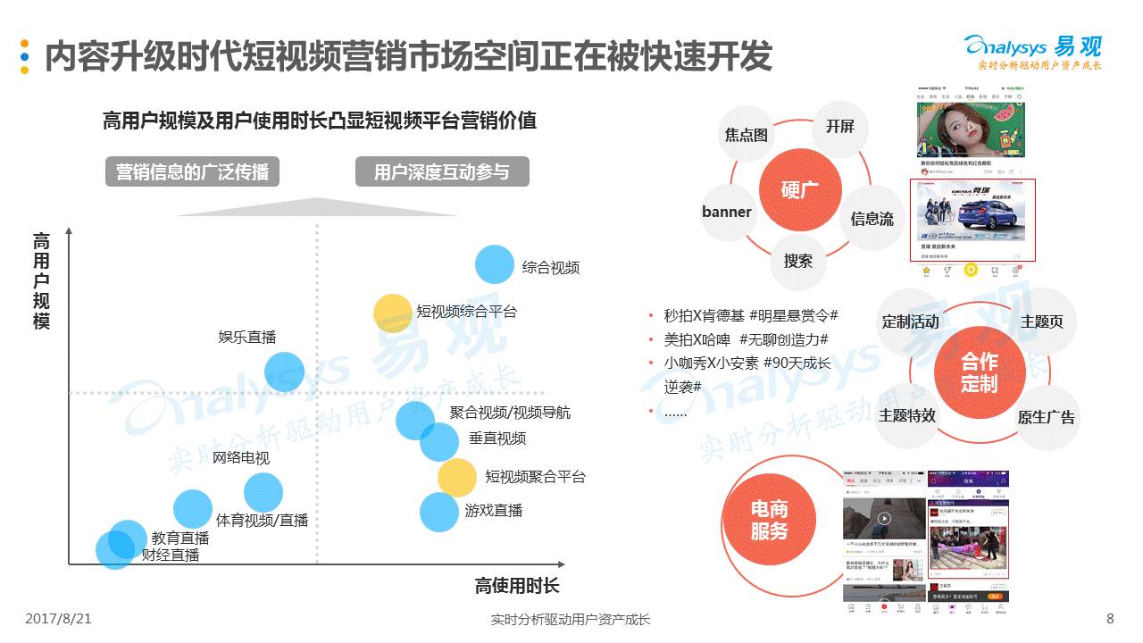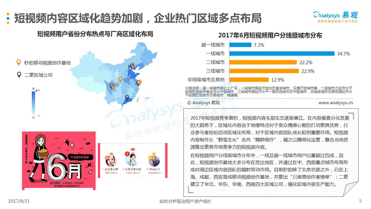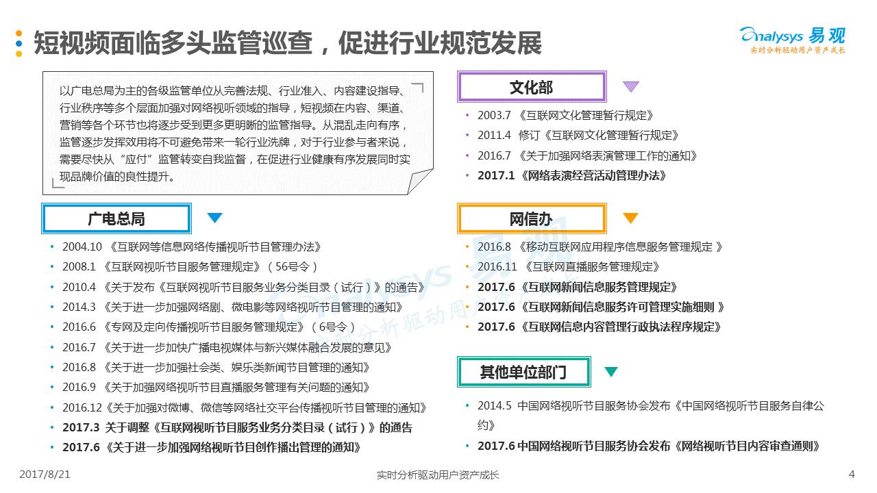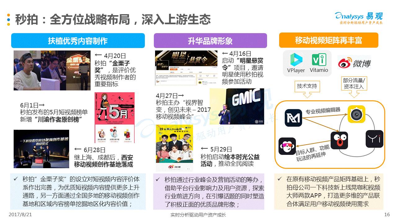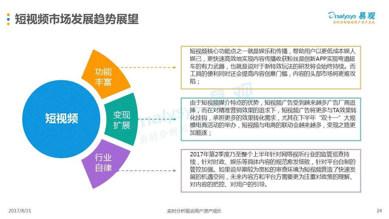 进入2017年以来,短视频持续成为市场各方关注的中心,行业规模持续攀升。在2017年第2季度,短视频领域在政策监管、企业布局、产业环节、产品创新、广告营销等多个层面都涌现出新的发展热点,本分析从行业现状热点出发,分析短视频市场主要环节和典型厂商,并对下阶段市场发展趋势作出展望。
