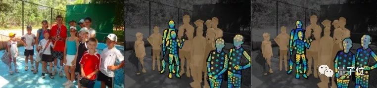 这两步,身体部位划分和等距点对应标注可以同时进行,可以获得很高的2D转3D一致性。此次研究,收集了5万人案例的标注数据,以及500多万个手动标注的对应点。以下是来自验证集的图像上的标注的可视化:收集的点的图像(左),U(中)和V(右)值。