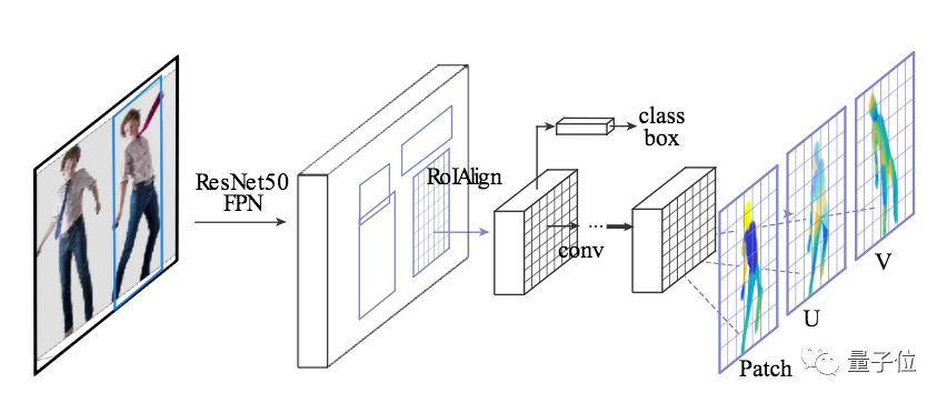 研究团队采用的是金字塔网络(FPN)特征的RCNN结构,和区域特征聚集方式ROI align pooling以获得每个选定区域内的密集部分标签和坐标。