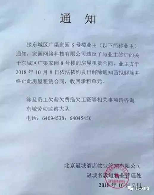 10月9日,36氪去家园网的办公地点(北京市东城区广渠门外的广渠家园8号楼)一探究竟,只看到光秃秃的大楼和物业留下的说明。