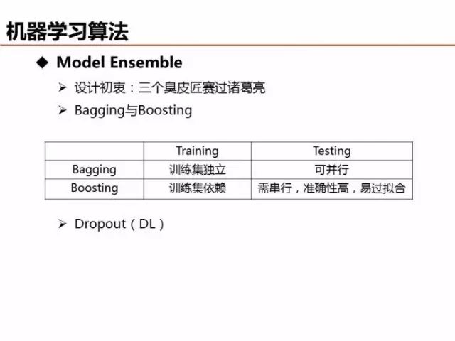 不同的数据任务场景,可以选择不同的Model Ensemble方法,对于深度学习,可以对隐层节点采用DropOut的方法实现类似的效果。