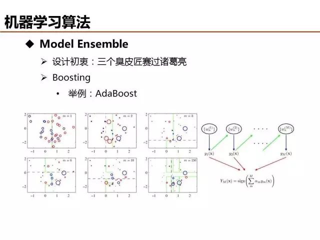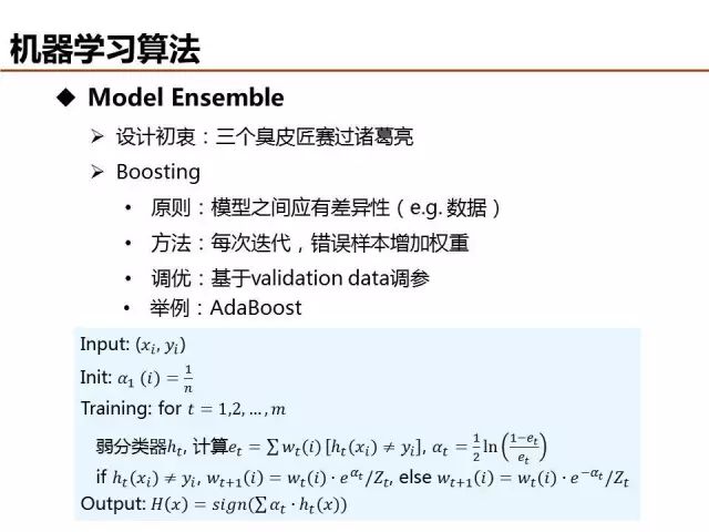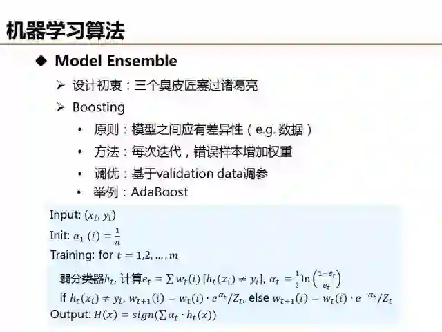 Boosting为Model Ensemble的另外一种方法,其思想为模型每次迭代时通过调整错误样本的损失权重提升对数据样本整体的处理精度,典型算法包括AdaBoost、GBDT等。