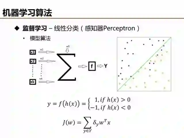 监督学习可分为分类和回归,感知器是最简单的线性分类器,现在实际应用比较少,但它是神经网络、深度学习的基本单元。