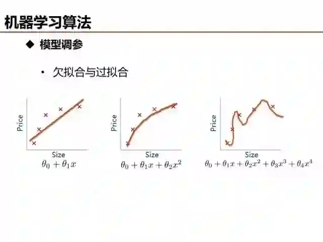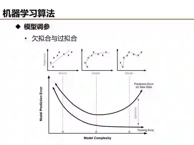 介绍了这么多机器学习基础算法,说一说评价模型优劣的基本准则。欠拟合和过拟合是经常出现的两种情况,简单的判定方法是比较训练误差和测试误差的关系,当欠拟合时,可以设计更多特征来提升模型训练精度,当过拟合时,可以优化特征量降低模型复杂度来提升模型测试精度。