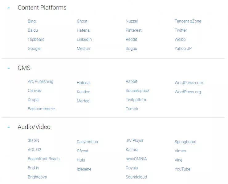 Google 除了建立一个专门的团队来进行 AMP 的相关开发任务之外,还与来自全球的广告商、内容提供商、CMS(内容管理系统)、Audio/Video 厂商达成了合作协议。以其中的内容提供商和 Audio/Video 厂商为例,支持 AMP 的包括 Google、百度、Bing、微博、搜狗、腾讯 QQ 空间、Medium、LinkedIn、雅虎日本、YouTube、Hulu 等,可以说是全球内容圈的半壁江山了。