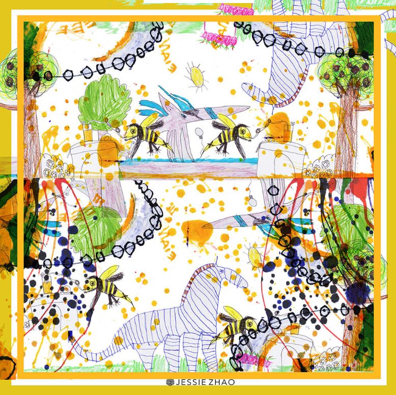 有一条丝巾,我在上面印的是我女儿的手绘。那是她3岁时候画的,有蜜蜂、斑马、芭蕉叶,笔触很幼稚,但非常纯粹、童真。在一场走秀的末尾,我穿着印着她手绘图案的裙子,从后台走出来致谢。当时她正被她爸爸抱着,坐在台下。她看到我的时候,一脸惊讶又骄傲的表情,我到现在都记得。后来她会在谷歌上搜我的名字,还非常喜欢画画。