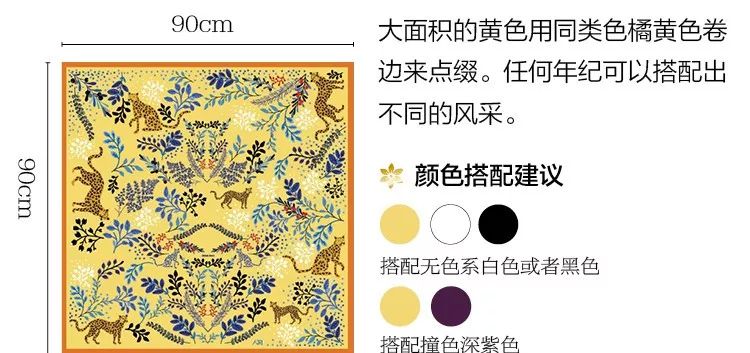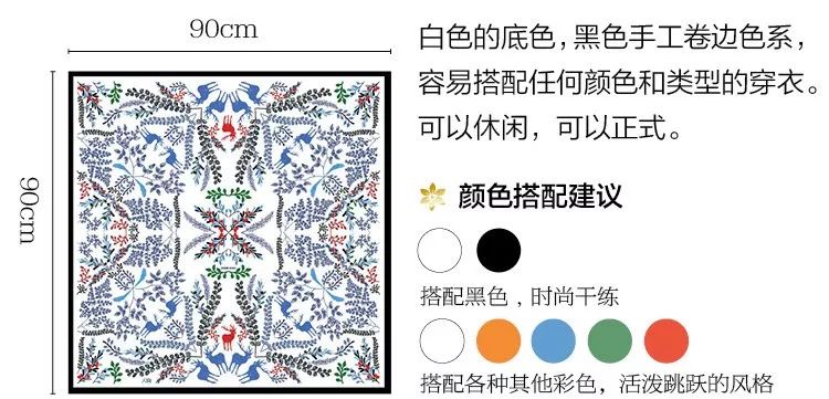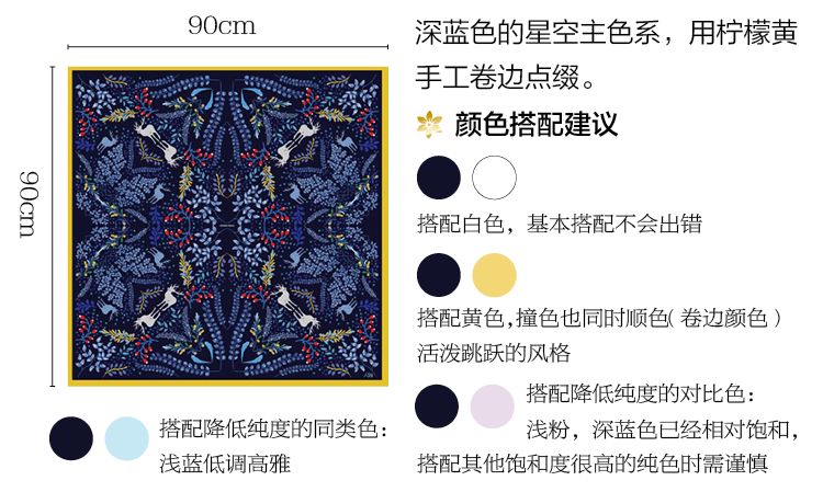 这三款丝巾都是90厘米的经典方巾尺寸, 适合多场景佩戴。设计师原创手绘图案,也可作为艺术品用画框裱起来,装饰房间或用来收藏欣赏。