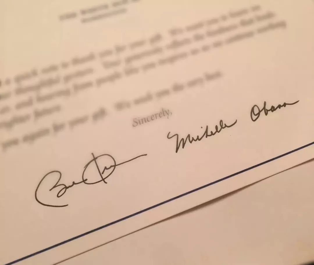 2016年11月18号,我收到了时任美国第一夫人米歇尔 · 奥巴马的信。信里面,她写了对《摩洛哥奥秘之旅》丝巾的欣赏,说她很喜欢戴(这款丝巾),并且鼓励我在设计事业中继续努力。句子长长短短,一共差不多10行,写在一张带蓝边的信纸上,落款是她和她丈夫:贝拉克 · 奥巴马、米歇尔 · 奥巴马。