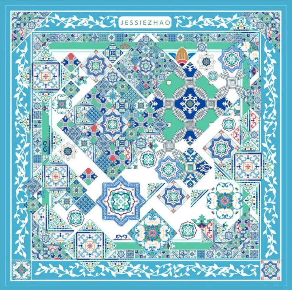 受到摩洛哥瓷砖块的启发,我做了这条名叫《摩洛哥奥秘之旅》的丝巾,上面充满了「对比」、「差异」和「平衡」。坚硬、厚重的瓷砖块,被印在质地柔软轻盈的丝绸上。砖块上原本完整、平衡的图案也被打乱、破坏,然后我把它们重新组合了一遍,每个角落的图案都不一样,又进行了一些中式的「留白」。重组后,图案在丝巾上形成了一种新的微妙平衡,质地、花纹显得冲撞又统一。