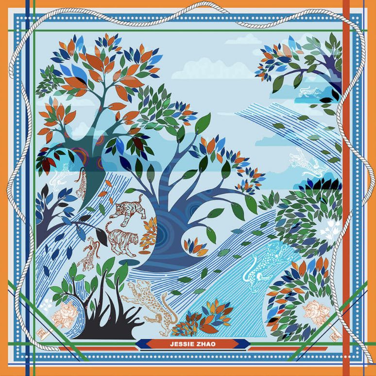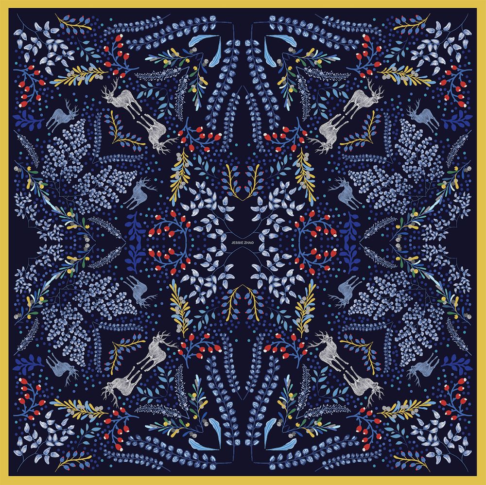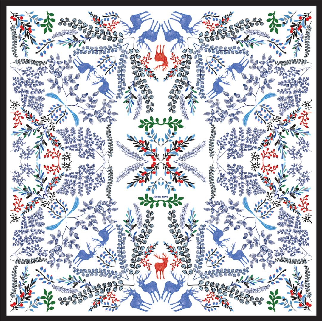 丝巾的世界中的Jessie Zhao,是个「出世」的人。她的丝巾上很少会出现「人」,属于大自然的草叶、枝条、花朵、动物,才是她丝巾设计中的常用元素。通过翻转、对称的方式,花草树木和生灵在大片的蓝和绿中互相交叠、映照,丝巾上的整幅图案变得平静、和谐,只有一片原始、狂野、静谧的大自然。