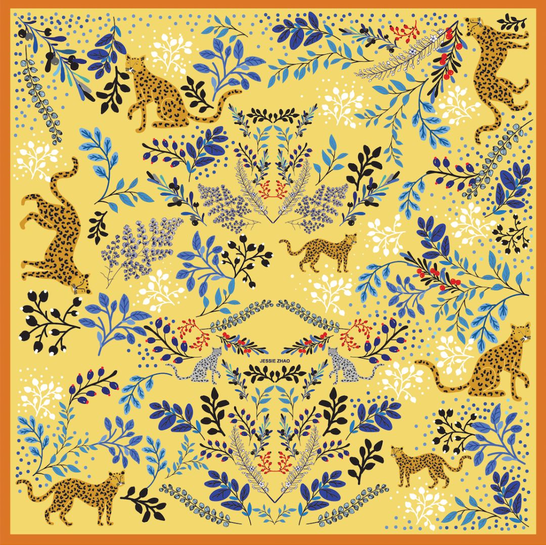 所以我的丝巾上是与车水马龙、喧嚣奔忙的城市生活不一样的自然景象——一片哑光的丝绸上,有蜷曲生长的植物枝条,有矫健漫步的猎豹,有落在土地上饱满丰润的果实,有倒悬的风铃一样的花朵……