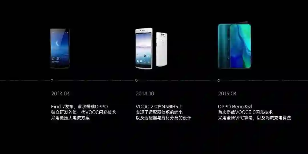 这就是 OPPO的 VOOC 闪充,从电池系统、线材、充电头都被重新定制过的 VOOC 闪充。可能你现在听起来感觉平平无奇,但是在 2014年那个年代,这些创新真的尤为可贵。