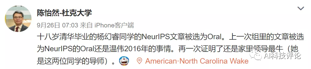 之后,杜克大学电子与计算机工程系陈怡然教授,在微博上晒出了杨幻睿的成绩——论文被NeurIPS 2020接收为最优等级的Oral 。
