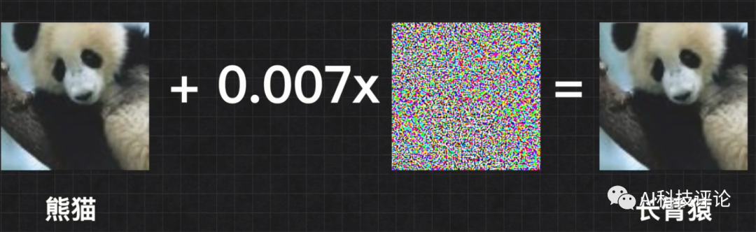 在下图中,将微小的噪声加到一张熊猫图片后,原本可被图像分类模型正确识别的熊猫被识别为了长臂猿,尽管人类肉眼完全无法分辨加噪声前后两张图片的区别。