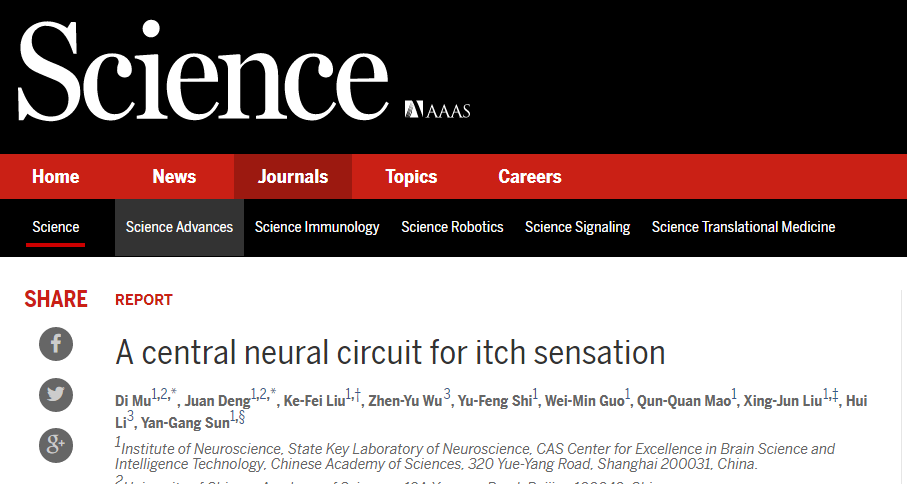 8月18日,《科学》杂志在线发表了中国科学院神经科学研究所、中国科学院脑科学与智能技术卓越创新中心、神经科学国家重点实验室孙衍刚研究组题为《痒觉的中枢环路》的研究论文。