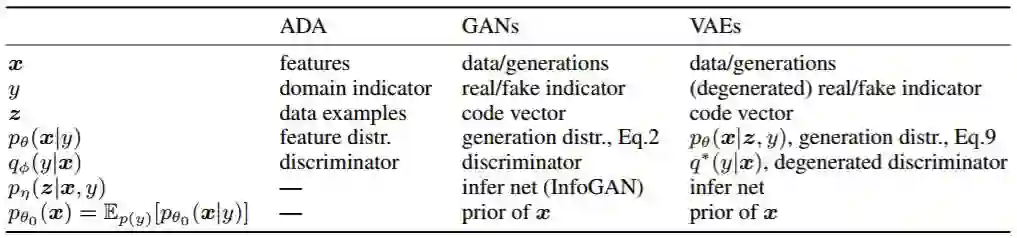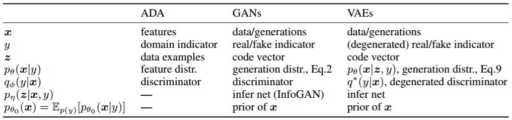 为了便于本论文的呈现和构建符号标记方法,我们首先使用我们提出的形式化对对抗域适应(ADA/Adversarial Domain Adaptation)进行了新的解释。然后我们表明 GAN 是 ADA 的一种带有退化的源域(degenerated source domain)的特例,我们还通过对目标(objective)的 KL 距离解释而揭示了其与 VAE 和 wake-sleep 算法的紧密关系。表 1 列出了这些方法中每个组件的对应关系。