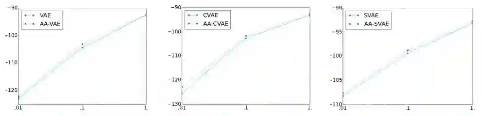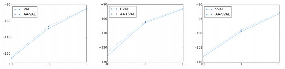 图 1:在 MNIST 测试集上的下限值。X 轴表示用于学习的训练数据的比例(0.01、0.1 和 1)。Y 轴表示下限值。实线表示基础模型;虚线表示对手激活的模型。左:VAE vs. AA-VAE;中:CVAE vs. AA-CVAE;右:SVAE vs. AA-SVAE,其中剩余的训练数据被用作无监督数据。