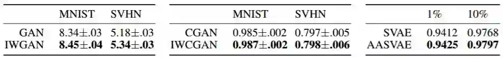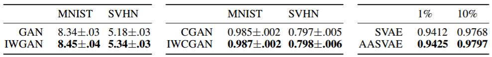 表 2:左:vanilla GAN 及其重要性加权的扩展的 Inception 分数。中:class-conditional GAN 及其 IW 扩展的生成的分类准确度。右:半监督 VAE 及其对手激活的变体在 MNIST 测试集上的分类准确度,使用了不同大小的真实标注的训练样本。