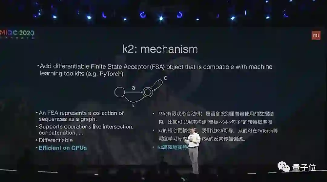 Povey博士还举了另一个例子:FSA(有限状态自动机)是语音识别里普遍使用的数据结构,比如可以用来构建“音标—词—句子”的转换概率图。而K2的核心贡献在于让FSA可导,从而可在PyTorch等深度学习库中来进行FSA的反向传播训练。