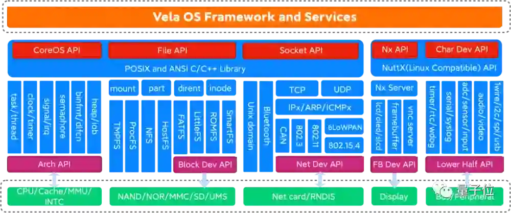 小米Vela主要分为三⼤部分:底层是NuttX内核、上层是Vela应⽤框架,⽽右侧是开发者⼯具。小米Vela的初衷是提供丰富的组件和易⽤的框架,把开发者解放出来。