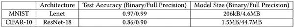 以下是 BMXNet 在 MNIST(手写识别)和 CIFAR-10(图像分类)数据集上训练得出的一个实验结果。