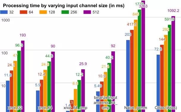 图中有颜色的长方形表示处理时间,xnor_32 和 xnor_64 分别表示 32 位和 64 位的 xnor gemm 操作符,xnor_64_omp 表示使用了 OpenMP 并行编程库的 64 位 xnor gemm 加速。二进制化输入和 xnor_64_omp 又将二进制化的处理时间也累积起来。尽管输入数据的二进制化也耗费了一些时间,但仍然得到比 Cblas 方法更好的结果。