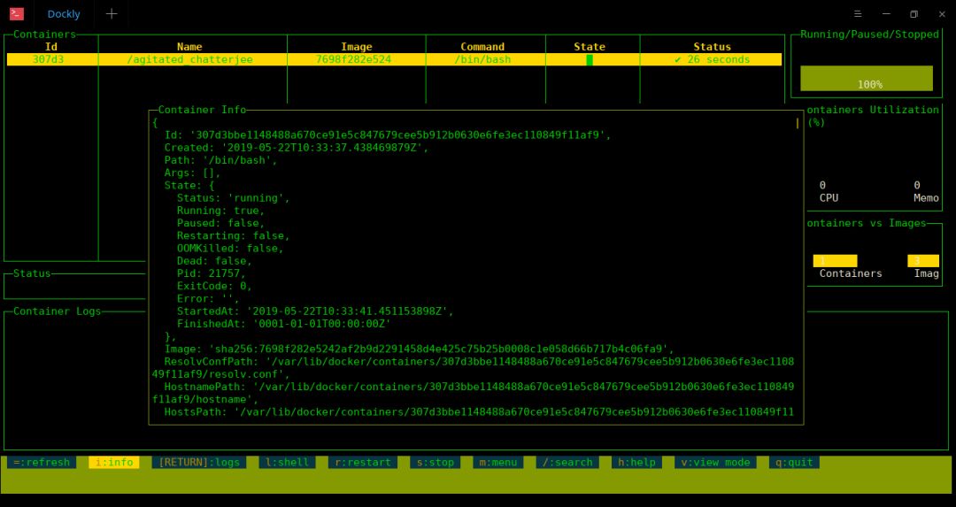 正如你在上面的截图中看到的,Dockly 在顶部显示了运行容器的以下信息: