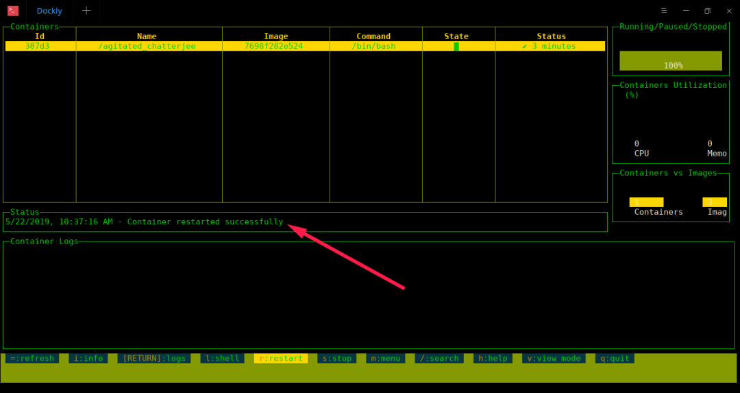 如果你想随时重启容器,只需选择它并按 r 即可重新启动。