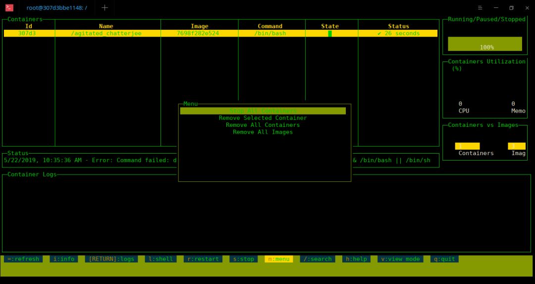 如果不再需要容器,我们可以立即停止和/或删除一个或所有容器。为此,请按 m 打开菜单。
