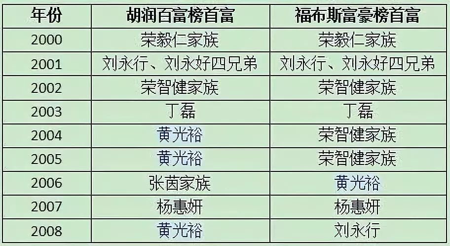 2004、2005、2008年,30多岁的黄光裕三度问鼎胡润大陆百富榜,并在2006年福布斯中国富豪榜排名第一。
