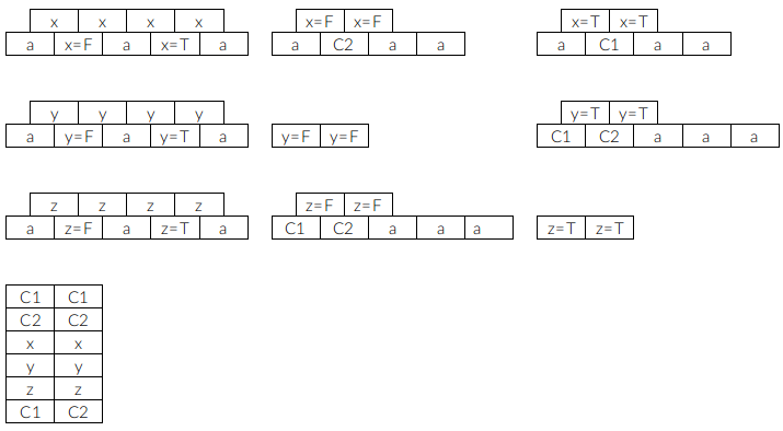 反过来,如果所有方块可以消去(也就是该关卡可以通关),那么公式可满足。注意到验证堆中的变量 xyz 的方块想要被消去,必须上部的 C1 C2 子句方块都先消去,而子句方块又受限于赋值方块,赋值方块受限于变量方块,变量方块的摆放方式决定了在变量赋值时,每个变量只能赋为 FALSE 或 TRUE 中的一个(具体来说,在游戏初期 4 个 x 方块中任意消去 3 个后,方块 x=F 和 x=T 中必然有一个未被解锁)。这就意味着方块消去的顺序蕴含了一个满足公式的赋值。