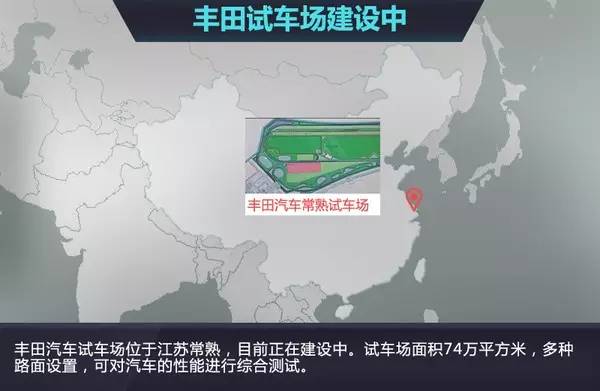 丰田在华试车场位于丰田汽车中国研发中心内。该研发中心是丰田全球最大的研发中心。目前正在建设中的丰田研发中心,占地面积达到了234万平方米 ,其中试车场为74万平方米。据悉,该试车场由多种赛道组成,路面和路况却比一般的赛道更丰富,包括多个弯道的柏油赛道,宽敞的直道,水泥路,砂石路面,土路,陡坡等,可以对汽车的性能进行综合测试。据悉,今后丰田汽车在中国生产的各类车型,上市前都将在这里完成测试。