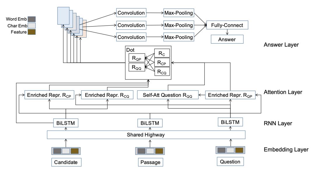 特征主要包括词性特征和匹配特征。词性特征是通过词性标注得到每个词的词性,然后将每个词的词性用一个 Embedding 表示。匹配特征包括篇章与问题、篇章与选项及选项与问题中词之间的完全匹配(两个词完全相同)和部分匹配(两个词属于包含关系)。最后词级别的词向量和字符级别的词向量以及相关特征拼接在一起,再输入到一个共享权重的 Highway 得到最终的表示。