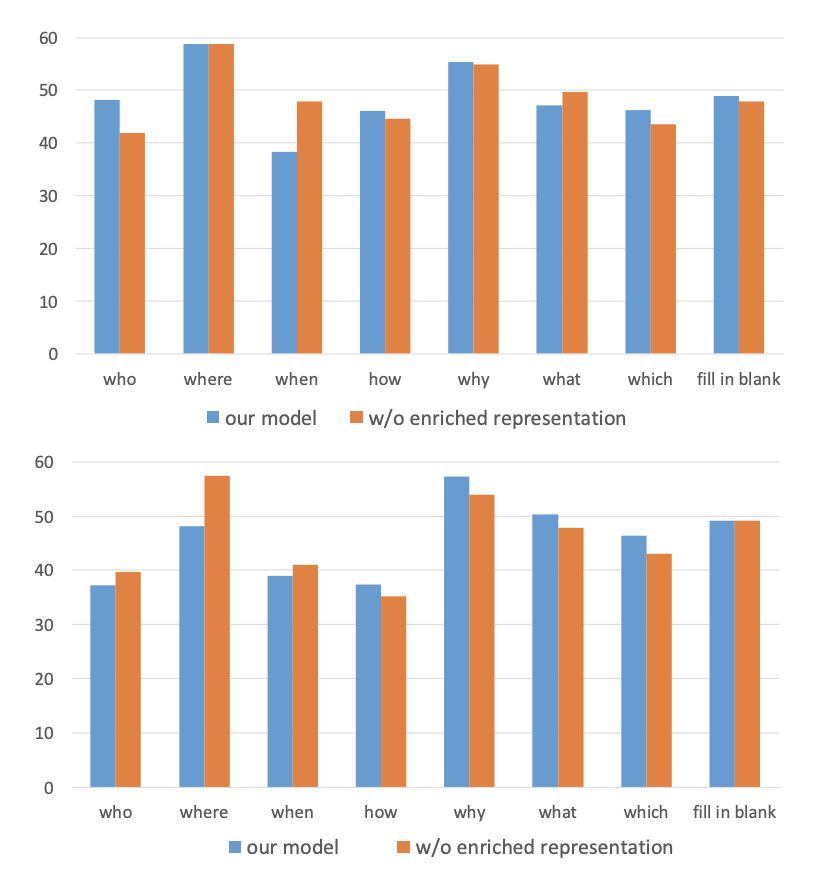 这部分主要是分析我们在 RACE 数据上不同类型的问题上的效果,对比的是不包含使用 Attention 丰富表示的模型,从图中(左图开发集,右图测试集)我们可以看出无论是在开发集还是在测试集上,我们的模型在 why 和 how 这两类问题上都是要明显高于参照系统,说明我们的系统在这类需要推理的问题上有着明显的优势。