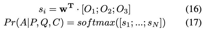 通过这个部分可以抽取到匹配特征(O1,O2,O3),后续我们将这些特征链接在一起输入到全连接神经网络,最终得到每个选项作为答案的概率。具体公式如图。