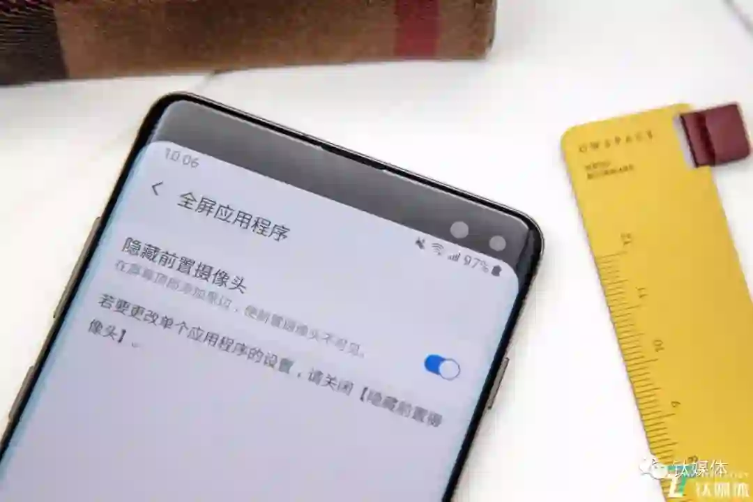 挖孔屏的设计并不是每个人都容易接受的,为了某些用户无法适应这样的设计,三星在GalaxyS10+的系统中也加入了“隐藏前置摄像头”的选项。